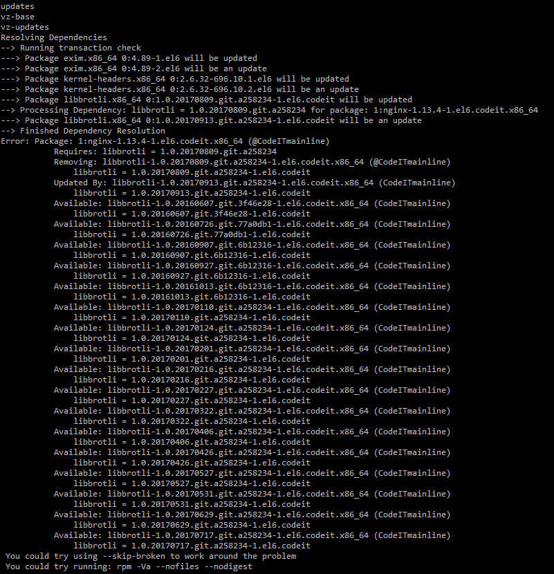 —> Processing Dependency: libbrotli = 1.0.20170809.git.a258234 for package: 1:nginx-1.13.4-1.el6.codeit.x86_64